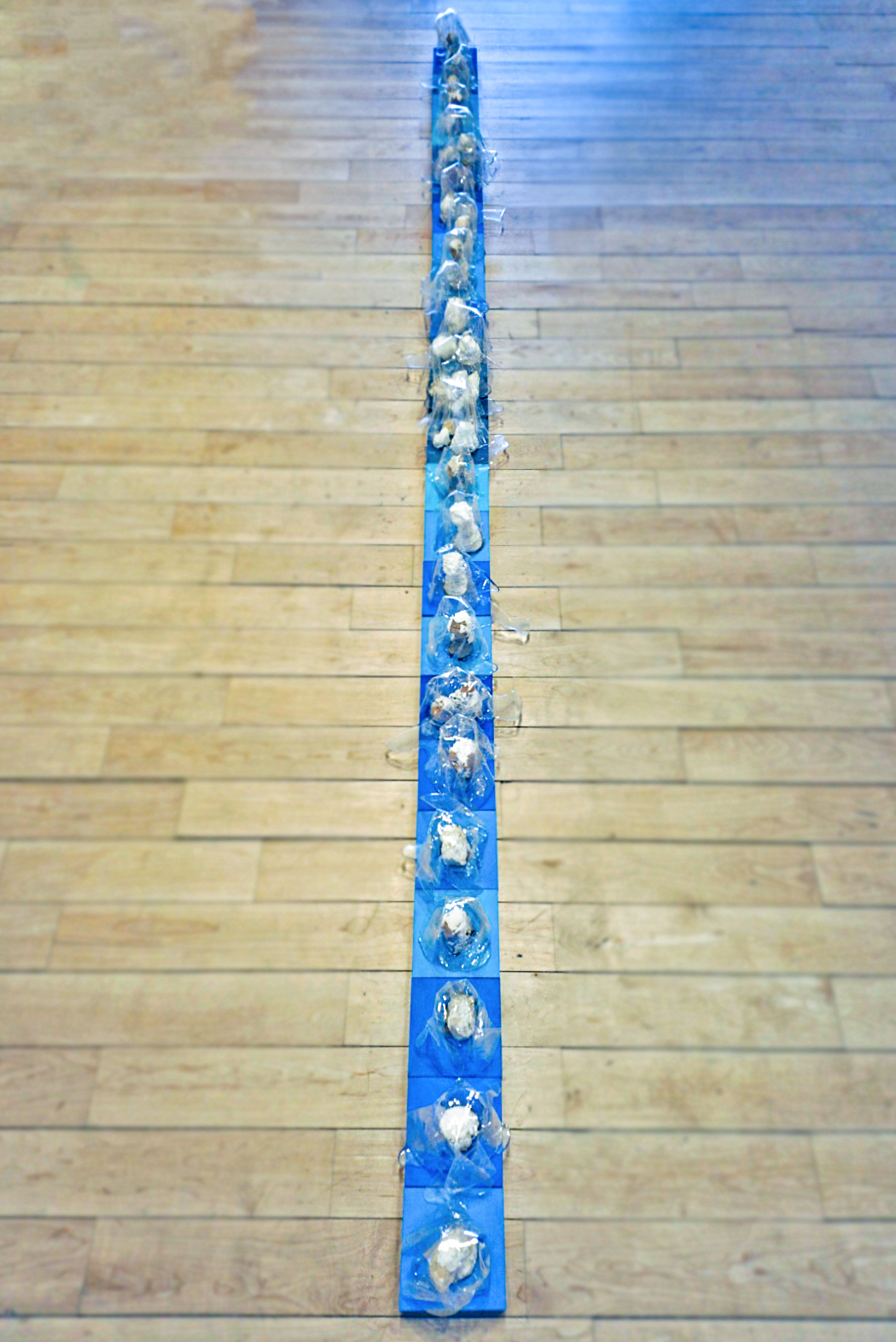 Clay, polyester film, epoxy resin, gouache on wood, mixed media